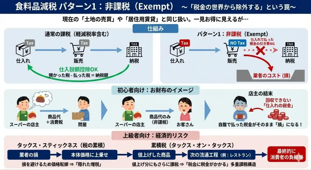 | 自由民主党 (高市政権) | パターン1 (非課税) | **「2年間限定で対象外」**を掲げる。事務負担を避けるため還付を行わない「非課税」扱いの可能性が高く、業者の仕入れ損(隠れ増税)のリスクあり。 |
