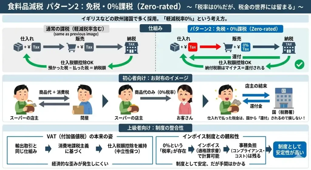 - インボイス制度との親和性: 0%という「税率」が存在するため、インボイス(適格請求書)による計算が成り立ちます。ただし、事務負担(コンプライアンス・コスト)は依然として残ります。